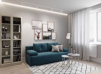 Спинка, выполненная в обивочной ткани, позволяет ставить диван в центре комнаты и зонировать пространство.