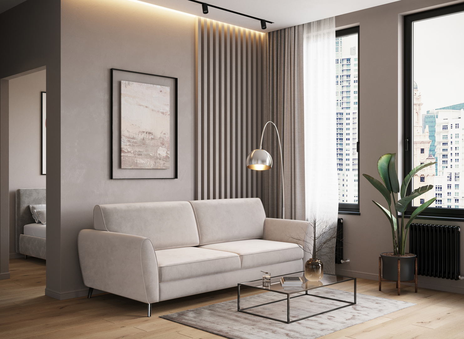 Спинка, выполненная в обивочной ткани, позволяет ставить диван в центре комнаты и зонировать пространство.