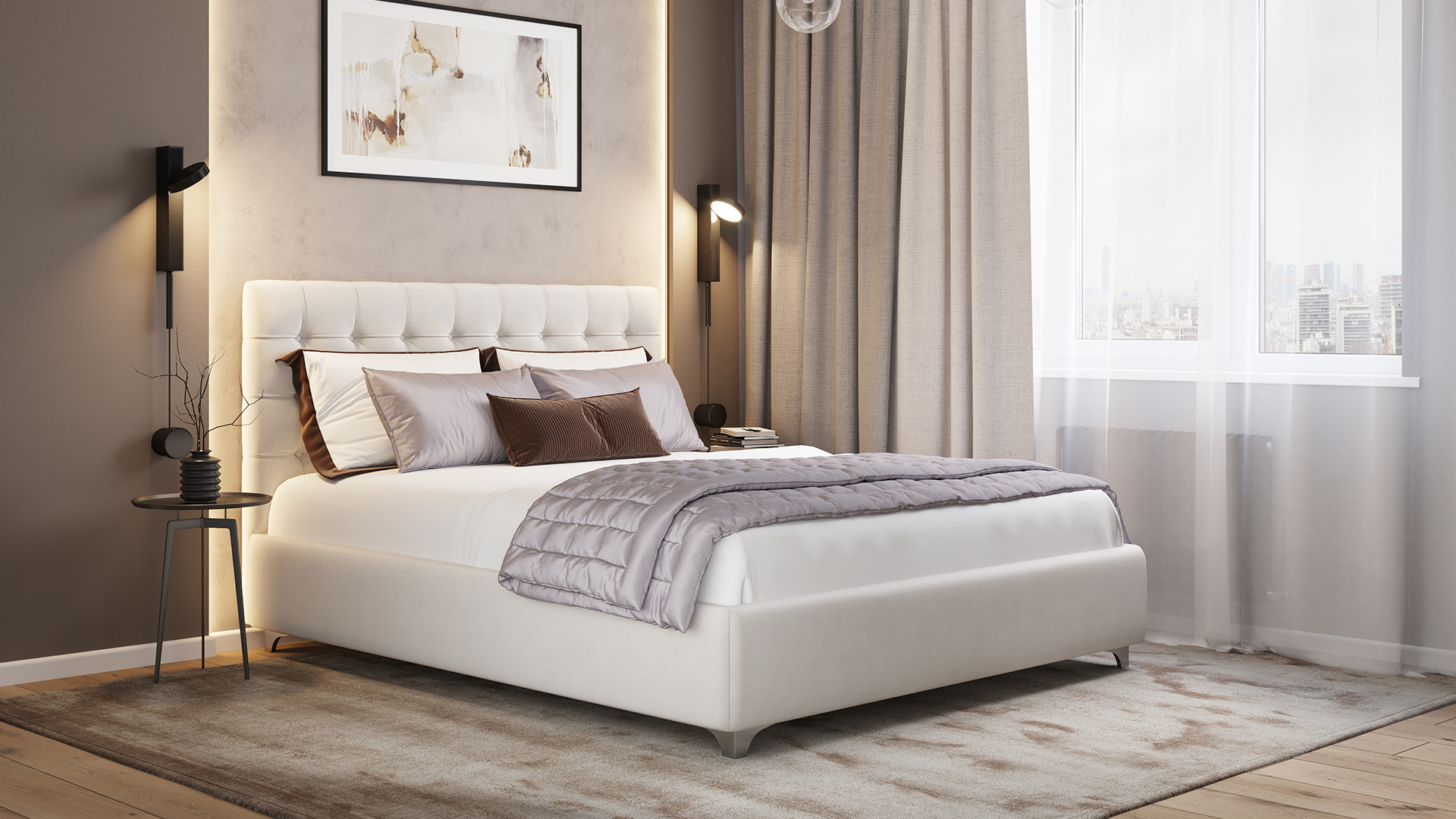 Разнообразие цветовой палитры позволит подобрать желаемый оттенок обивочной ткани. Использование светлых цветов поддержит настроение стиля «Сканди». Приглушенные насыщенные оттенки оформят кровать в стиле «Лофт». Нейтральные оттенки в цвет интерьера обыграют спальню в Современном стиле.