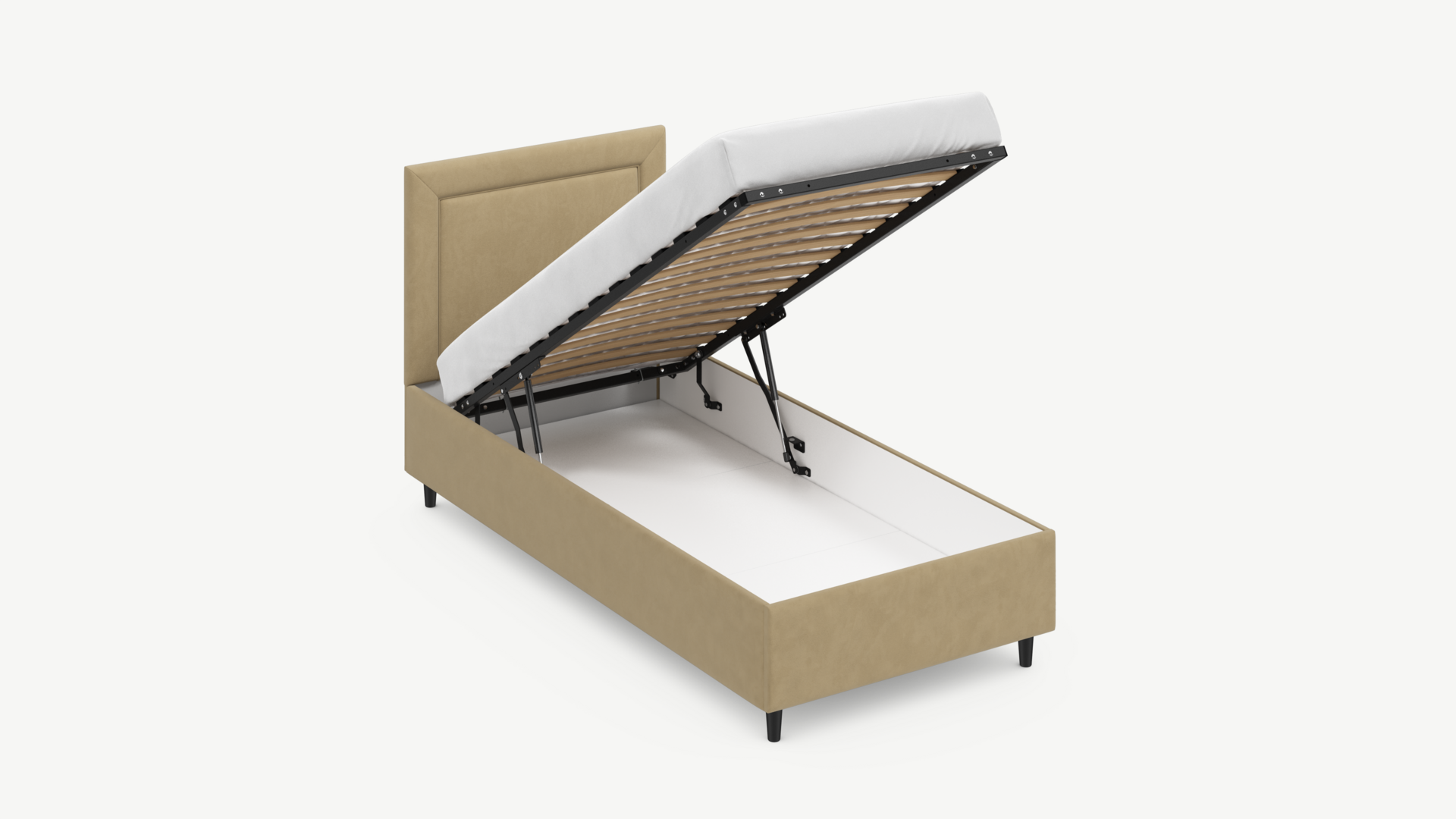 • Скрытая под основанием вместительная емкость без внутренних перегородок позволяет использовать всю площадь подкроватного пространства для хранения вещей.