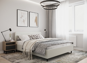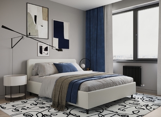 Царга, задающая пропорции, благодаря гладкости своей фактуры подчеркивает центральный элемент декора. Высокие опоры приподнимают фигуру кровати над полом и добавляют её образу визуальной легкости.