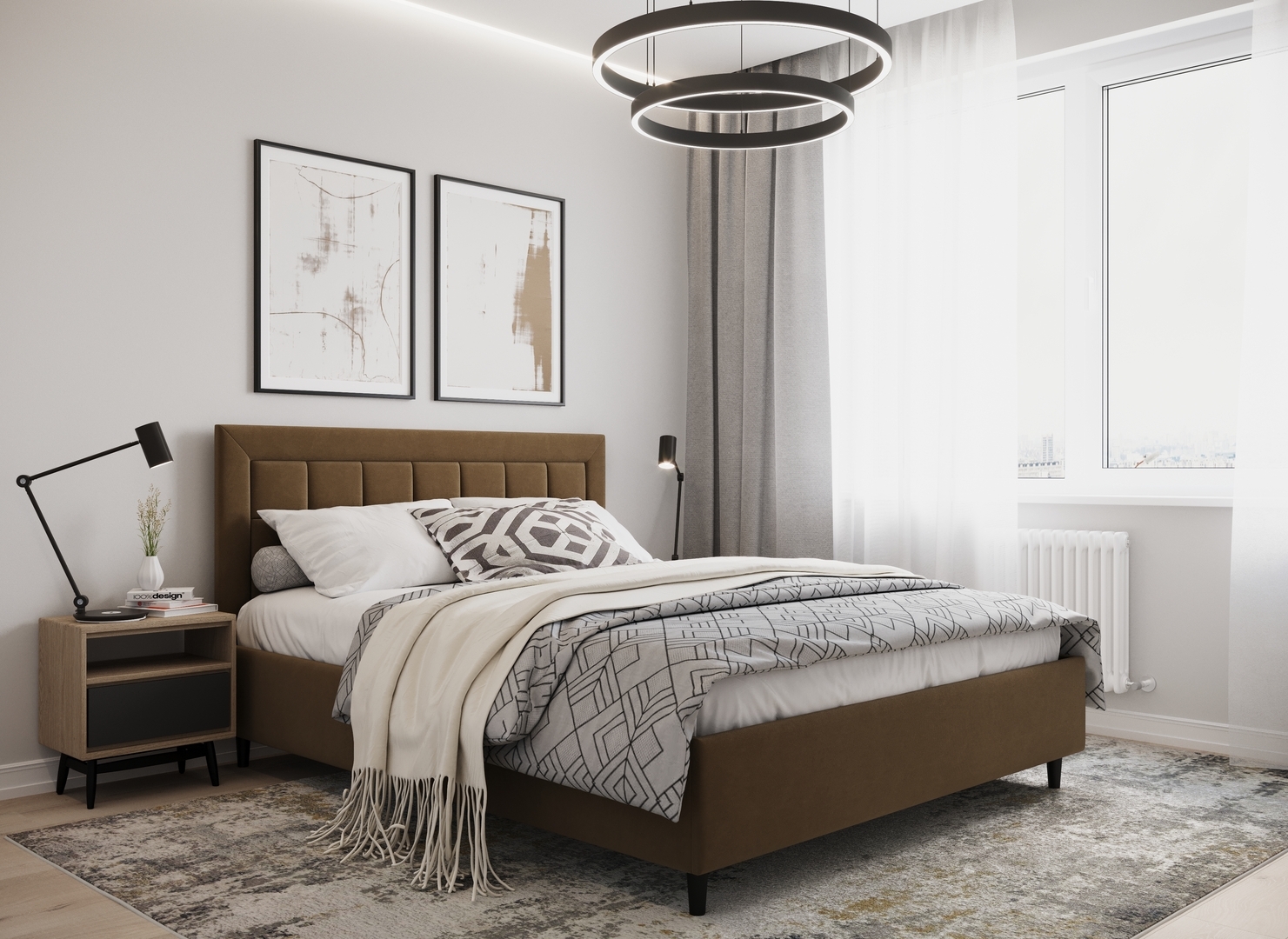 Создать гармоничный интерьер и завершить образ спальни помогут дополнительные аксессуары, например: тумбы, банкетки, подушки.