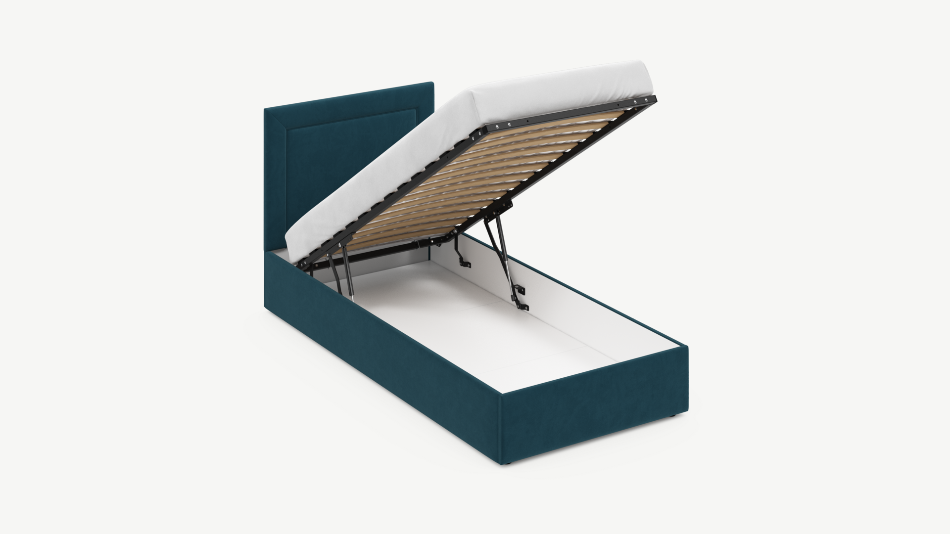 Вместительная емкость под кроватью без внутренних перегородок позволяет использовать для хранения вещей 100% пространства.