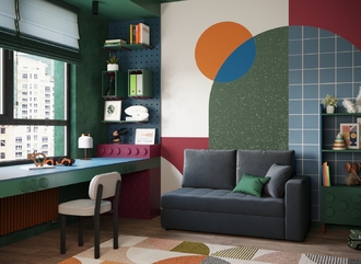 Спинка, выполненная в обивочной ткани, позволяет ставить диван в центре комнаты и зонировать пространство.