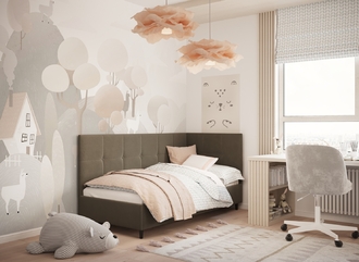 Угловая односпальная кровать MOON FAMILY 1261 с мягкой спинкой и изголовьем создаст в Вашей спальне ощущение уюта. Крупная квадратная стежка привносит в интерьер графических акцентов, а вставка из пуговиц наполняет пространство ощущением домашнего тепла.