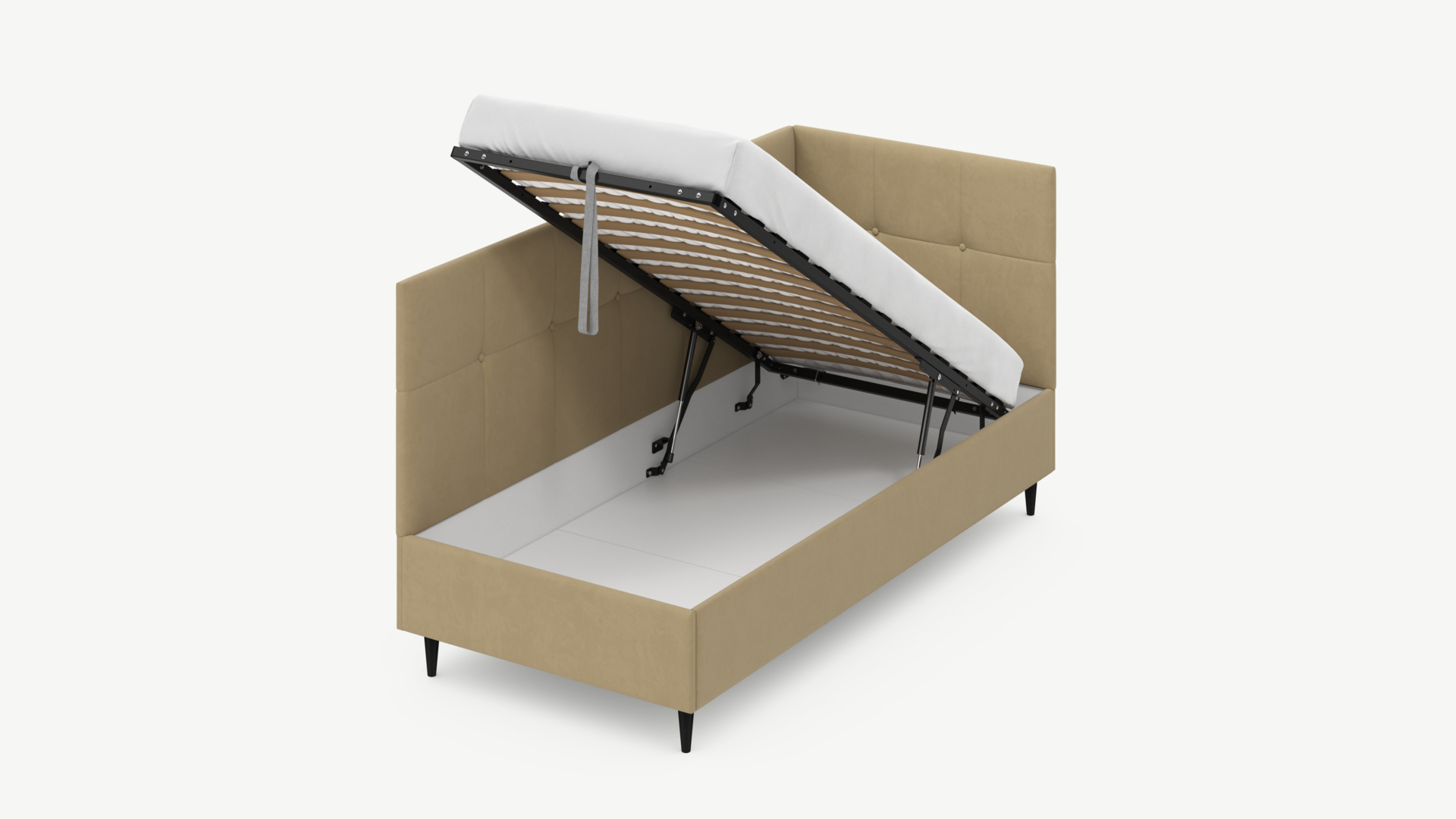 • Регулируемый подъемный механизм имеет два положения установки газовых амортизаторов в зависимости от веса матраса. Это дает возможность оптимально подстраивать угол подъема основания, а также плавно и бесшумно поднимать и опускать спальное место.