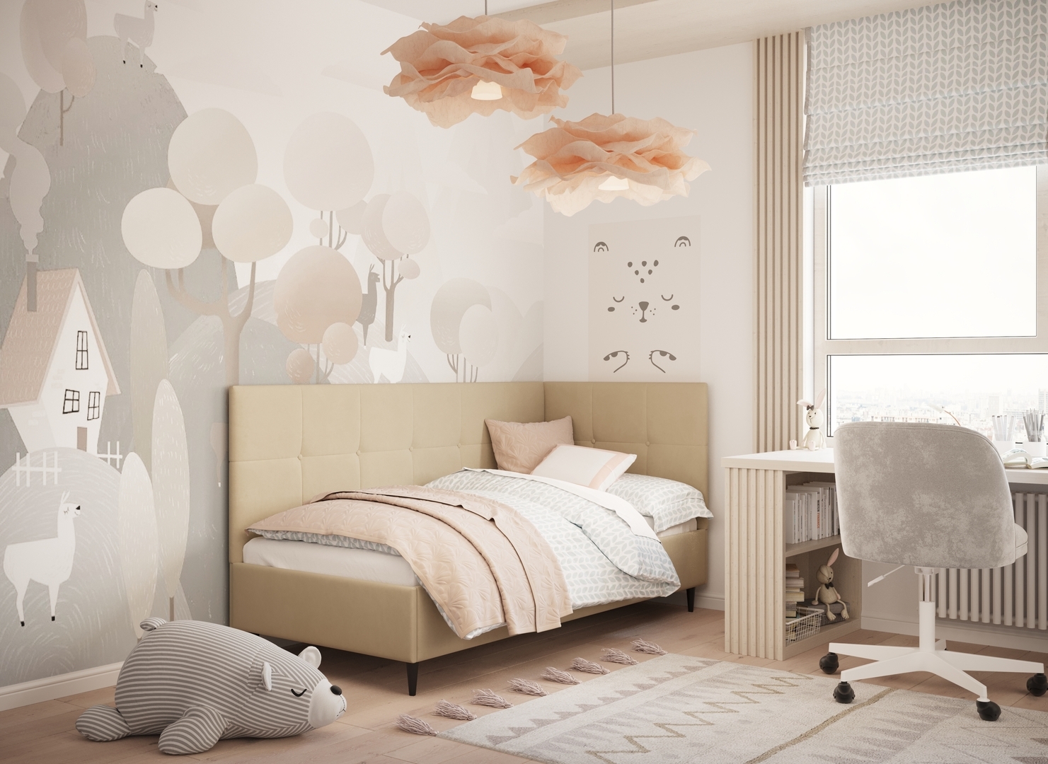Угловая односпальная кровать MOON FAMILY 1261 с мягкой спинкой и изголовьем создаст в Вашей спальне ощущение уюта. Крупная квадратная стежка привносит в интерьер графических акцентов, а вставка из пуговиц наполняет пространство ощущением домашнего тепла.