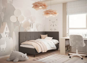 Угловая односпальная кровать MOON FAMILY 1261 с мягкой спинкой и изголовьем создаст в Вашей спальне ощущение уюта. Крупная квадратная стежка привносит в интерьер графических акцентов, а вставка из пуговиц наполняет пространство ощущением домашнего тепла.