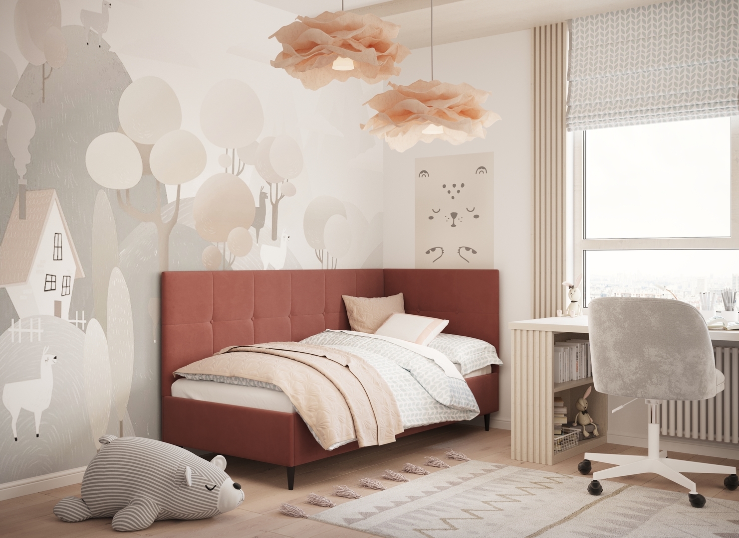 MOON FAMILY 1261 объединяет функциональность и стиль, создавая гармоничное пространство для отдыха и творчества. Кровать доступна в левостороннем и правостороннем исполнении, что позволяет легко адаптировать ее под любые интерьерные особенности.