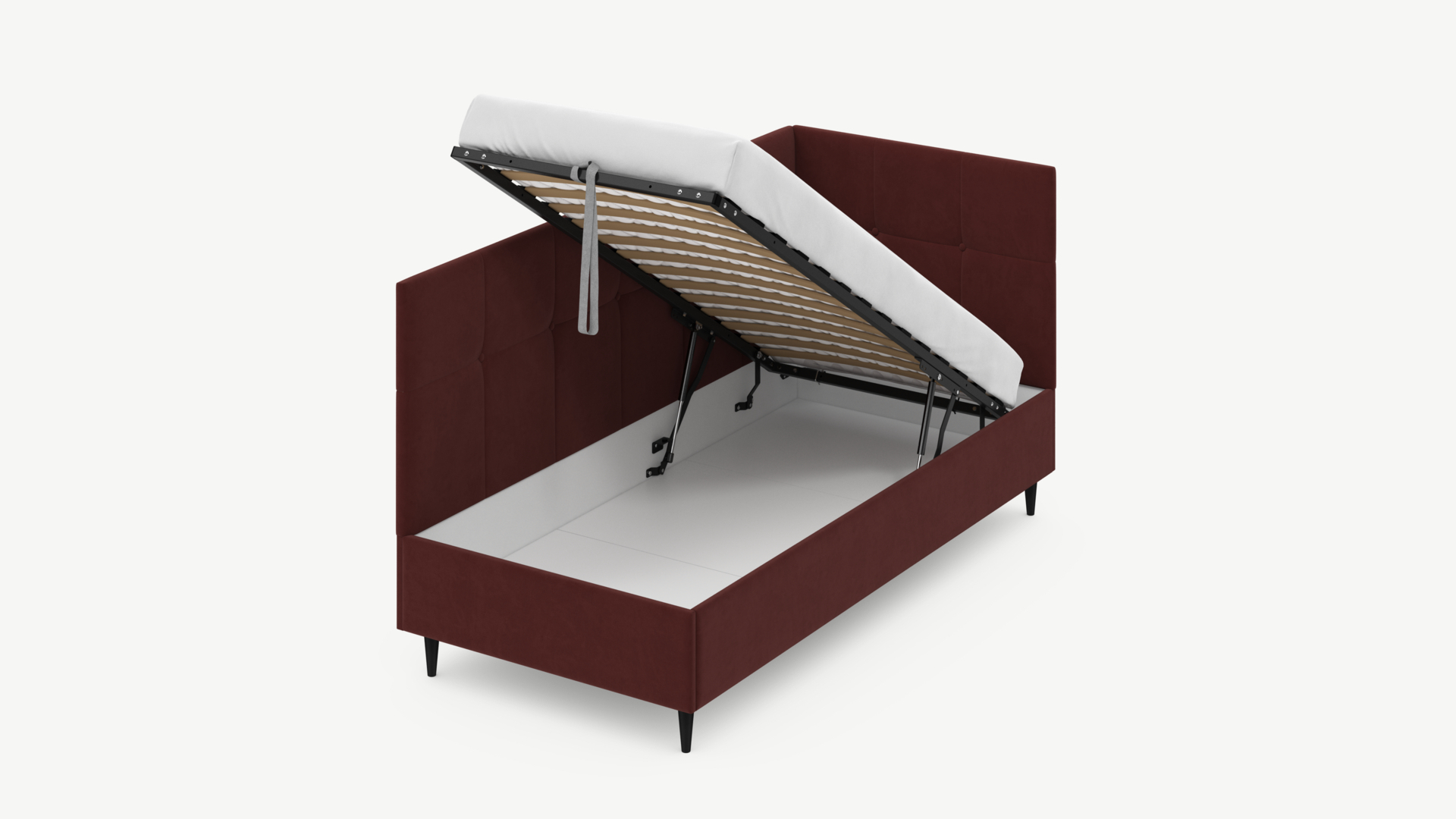 • Регулируемый подъемный механизм имеет два положения установки газовых амортизаторов в зависимости от веса матраса. Это дает возможность оптимально подстраивать угол подъема основания, а также плавно и бесшумно поднимать и опускать спальное место.