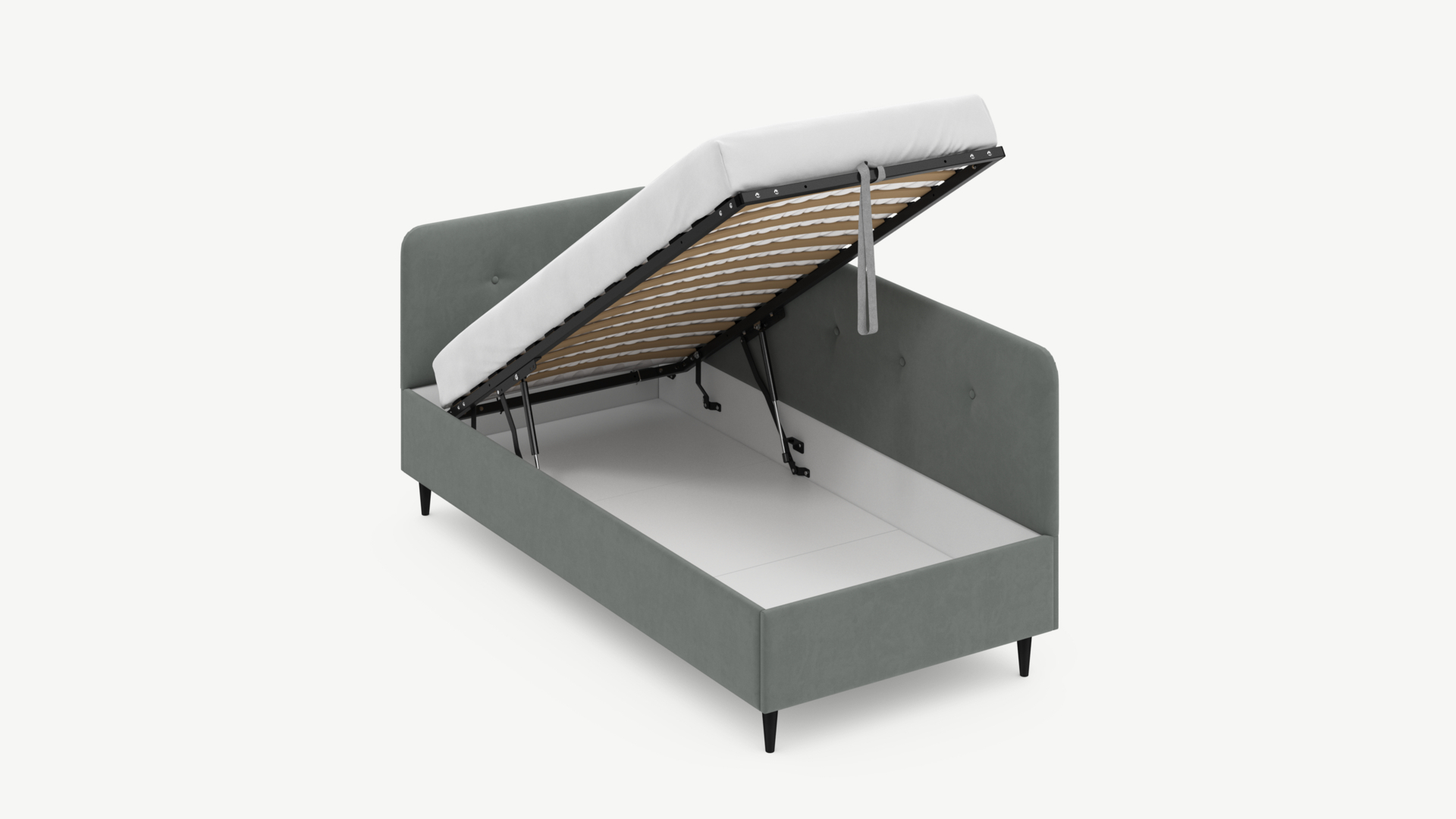 • Скрытая под основанием вместительная емкость без внутренних перегородок позволяет использовать всю площадь подкроватного пространства для хранения вещей.