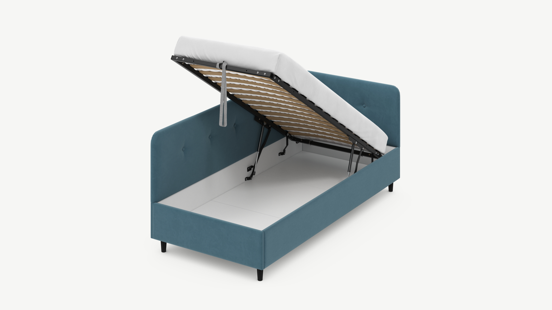 - Скрытая под основанием вместительная емкость без внутренних перегородок позволяет использовать всю площадь подкроватного пространства для хранения вещей.
