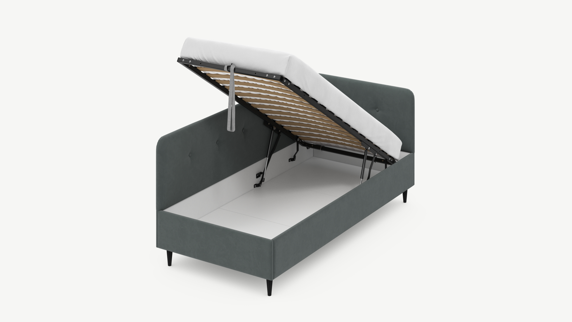 • Скрытая под основанием вместительная емкость без внутренних перегородок позволяет использовать всю площадь подкроватного пространства для хранения вещей.