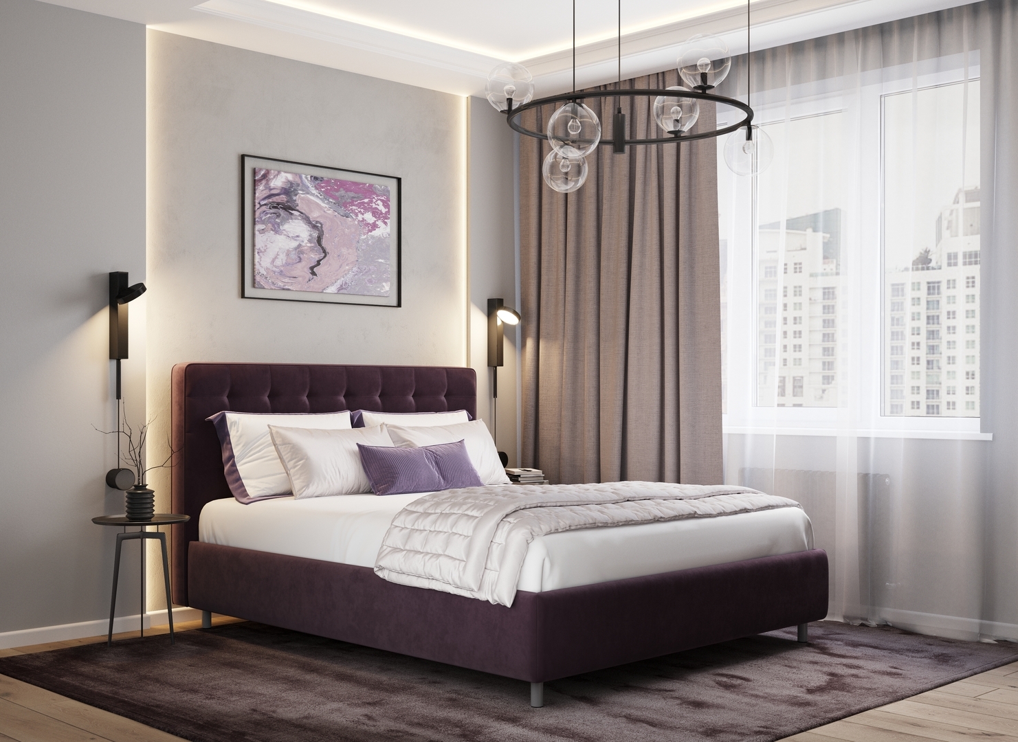 Оформите образ кровати, выбирая обивочный материал, который подчеркнет звучание Вашей спальни и отразит Ваш вкус. Обратите внимание на однотонный гладкий велюр, который усиливает объемную фактуру стежки.
