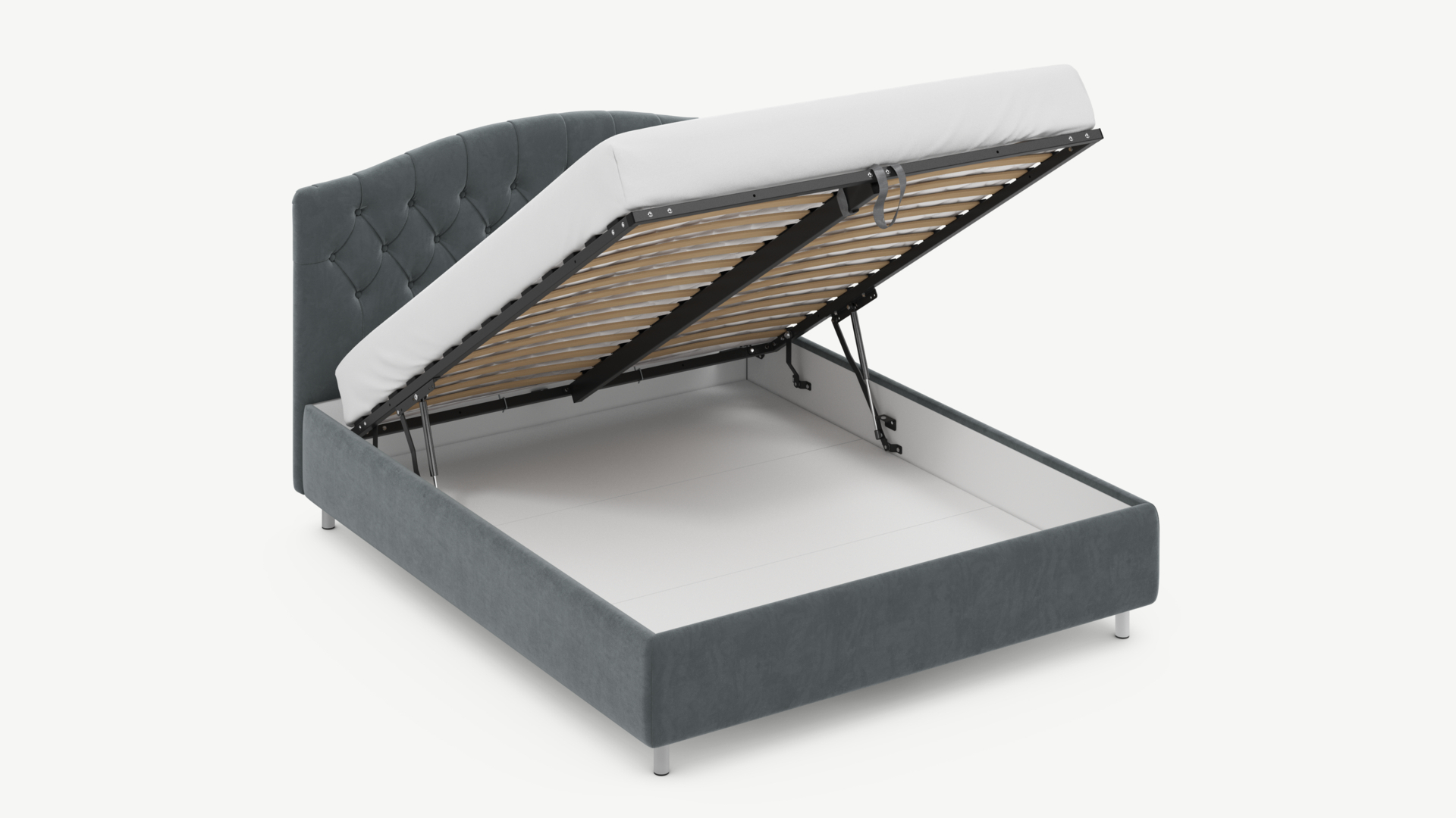 • Скрытая под основанием вместительная емкость без внутренних перегородок позволяет использовать всю площадь подкроватного пространства для хранения вещей.