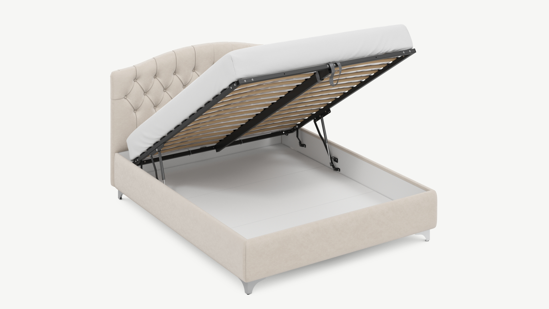 • Скрытая под основанием вместительная емкость без внутренних перегородок позволяет использовать всю площадь подкроватного пространства для хранения вещей.